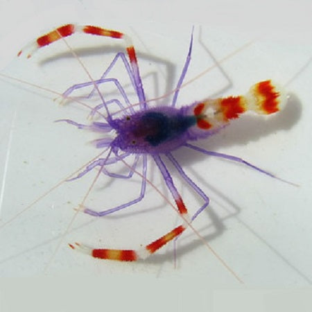 The Blue Coral Banded Shrimp differs in having blue on the abdomen and legs, and it's also much less frequently available than the regularly seen coral banded shrimp. These popular shrimps are easy to keep and are great in reef tanks. They require no special care once acclimated, and the will eat about anything offered. They may also eat bristleworms. (hurray!) Like all shrimps, they require careful acclimation.Hardy, but must be acclimated slowly to avoid any salinity and/or pH shock. These animals are known to sometimes loose claws or legs during shipping but no worries, they will grow back after the next molt.