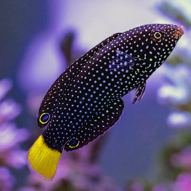 Yellowtail Wrasse - Anampses meleagrides: The Yellowtail Wrasse is also referred to as the Yellow-tail Tamarin, or Spotted Wrasse. It has a black body covered with varying sized white dots. The tail is bright yellow. Yellowtail Wrasse is a high maintenance fish. It is one of the most beautiful wrasse but unfortunately Yellowtail Wrasse is difficult to be keep in captivity. The members of Anampses genus are rated lowest in terms of survival in aquarium usually due to feeding habits.
