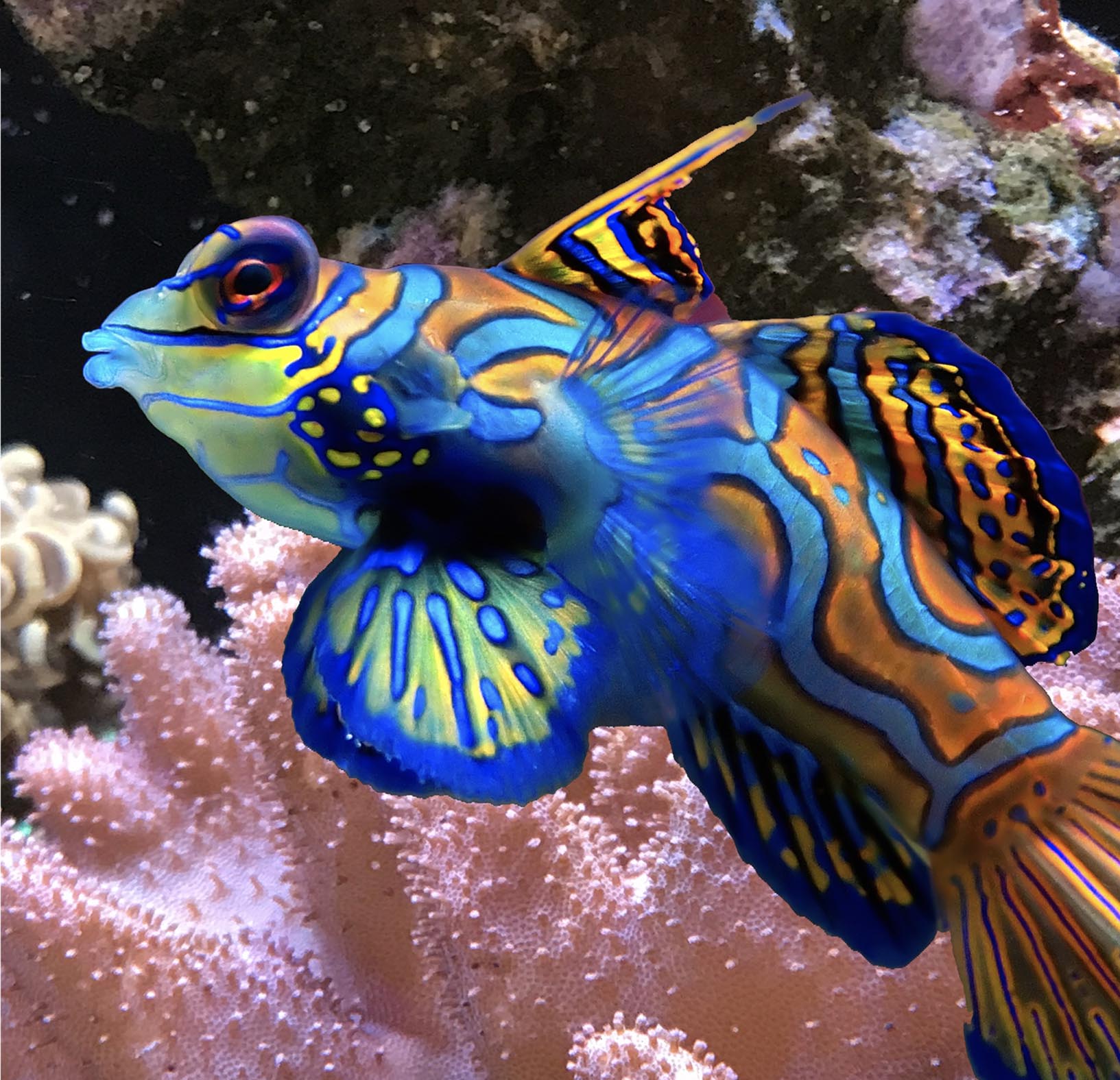 The Mandarin is a secretive species known from shallow protected lagoons and inshore reefs. Here it is found in small groups, over silty substrates with coral and rubble, to depths of 18m (59ft). This is a popular aquarium fish that is best added to a well established reef tank, where there will be plenty of live rock and live substrate that supports its natural diet of tiny crustaceans, worms, and small sessile invertebrate life. There should be plenty of hiding places amongst the rockwork, with enough depth of substrate for the fish to bury if it feels threatened. There should be relatively calm areas in the tank that allow the Mandarin to locate food successfully. Tankmates should be peaceful and of an easygoing nature so that the Mandarin does not feel harassed and subsequently stops venturing out to feed. It is best to keep a single specimen only, or a compatible male-female pair (females usually prefer a larger sized male). Groups should only be considered for exceptionally spacious aquaria, as in the average sized aquarium, males will fight vigorously. Not to be kept alongside the similar species S. picturatus. When choosing your Mandarin, check that its body is not emaciated, and that it is actively searching for food. This fish is not recommended for beginners. May also be seen on sale as Striped Mandarin, Mandarinfish, or Mandarin Dragonet.