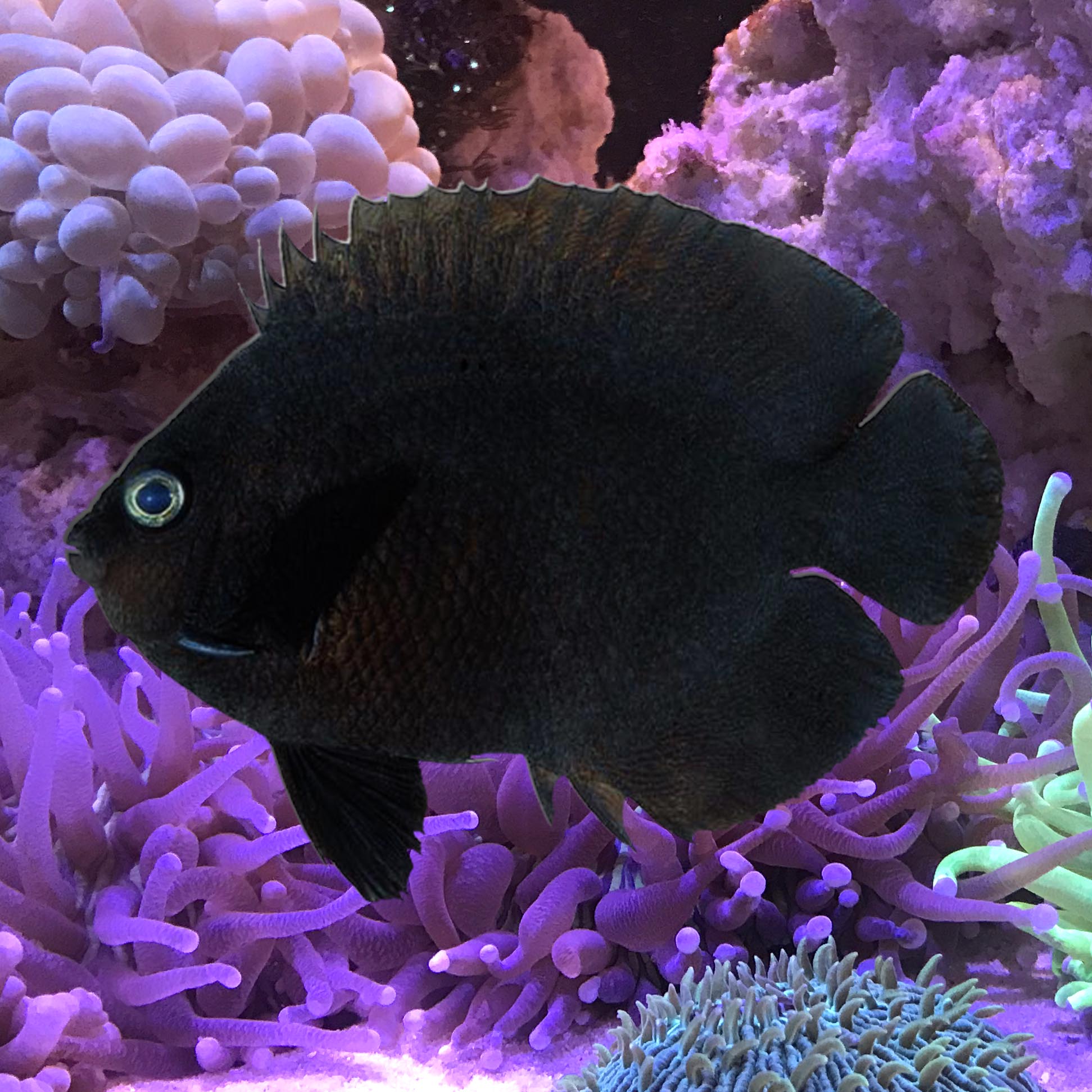 This black sensation stands out as an excellent addition to the home aquarium. One of the less aggressive of the family, the Midnight Angelfish is one addition that is more likely to behave itself in the home aquarium.