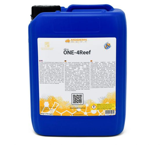 ONE-4Reef is a super-concentrated pure organic form of our proportional consumption reef-keeping system in one canister. It contains all necessary trace elements in natural seawater, organic micro-nutrients, and amino acids in one product! Ready to use to maintain a thriving and colorful reef aquarium. Highly concentrated (1L contains 50.160 mg/l calcium and 7.000 °dKH/l). Specially designed to be used with our Reef Keeping System (RKS) but can also be used alone or in aquariums with calcium reactors.