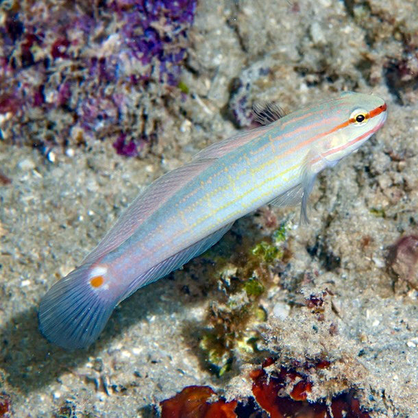The Orange Lined Goby feeds on a variety of small crustaceans, vitamin-enriched brine shrimp (live or frozen), mysis shrimp, prepared foods for herbivores, and a quality flake or pellet food.