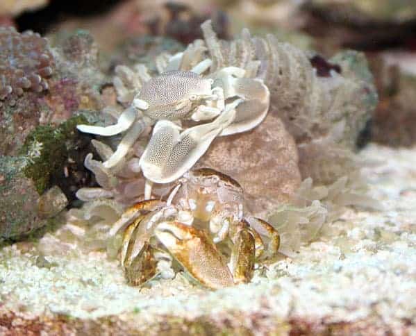 Porcelain Anemone Crabs live together in pairs under the protection of an anemone. It may attempt to defend its territory from clownfish that try to establish themselves among the anemone, although the clownfish generally prevails. It is aggressive toward conspecifics, and should not be kept with larger, aggressive crabs which may attack it.