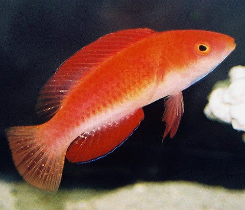 The Redfin Wrasse originates from the Philippines and enjoys the rubble areas of the outer reefs . This peaceful wrasse is a great addition to any Reef Aquarium adding stunning coloration. Like other wrasses, the males during courtship will display increased color intensity. Colors may vary depending on the fish's mood.
